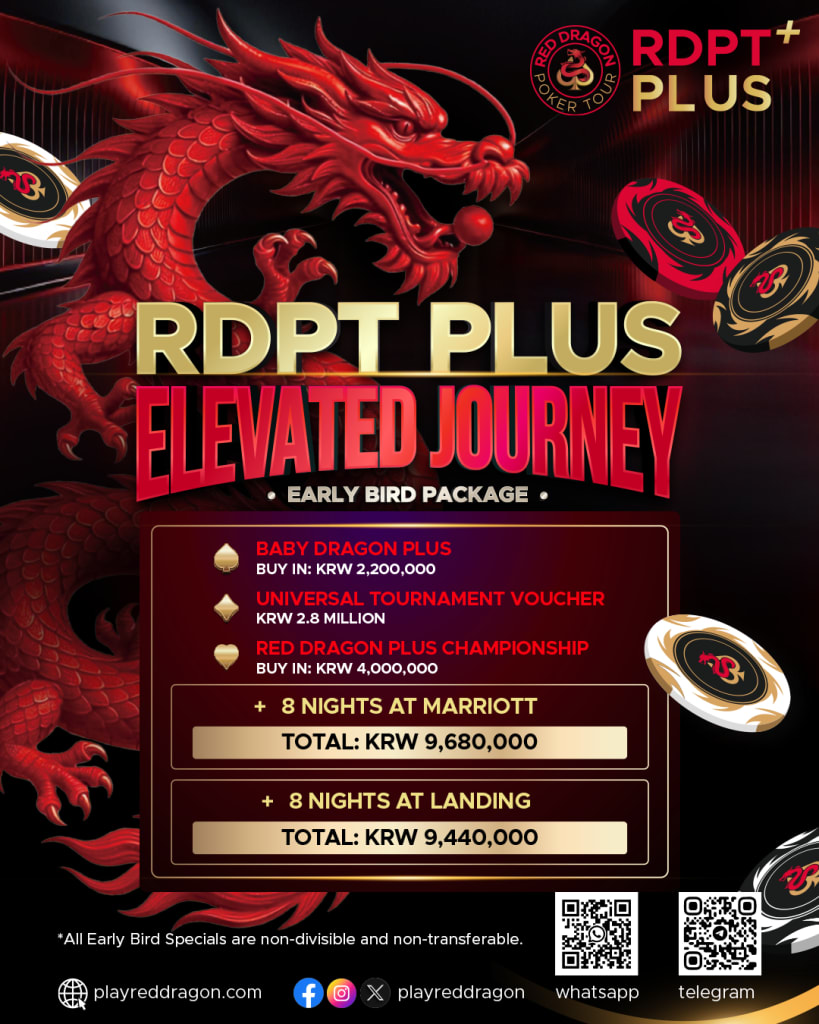 1. RDPT PLUS Elevated Journey – KRW 9,680,000 (8 Marriott nights) or KRW 9,440,000 (8 Landing Casino nights) includes entry to Baby Dragon Plus, a Universal Tournament Voucher worth KRW 2,800,000, and the Red Dragon Plus Championship, along with eight nights of accommodation at the selected property.
