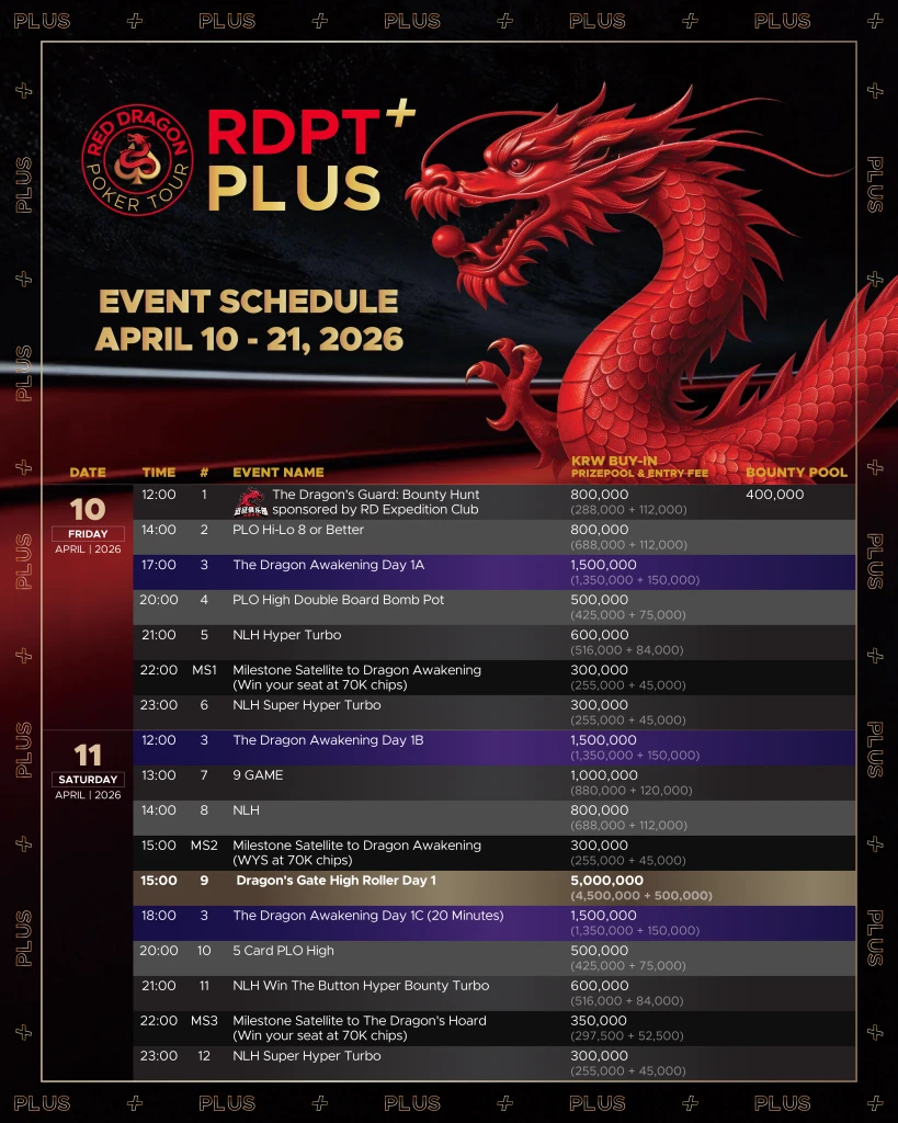 The Red Dragon Poker Tour returns to Jeju this April with the launch of RDPT PLUS , a new series designed around depth, structure, and clearly defined championship moments. Running from April 10 to 21 at Les A Casino, formerly Landing Casino , RDPT PLUS moves away from the crowded festival model and instead presents a tightly curated lineup built for players who value endurance and long-form competition.